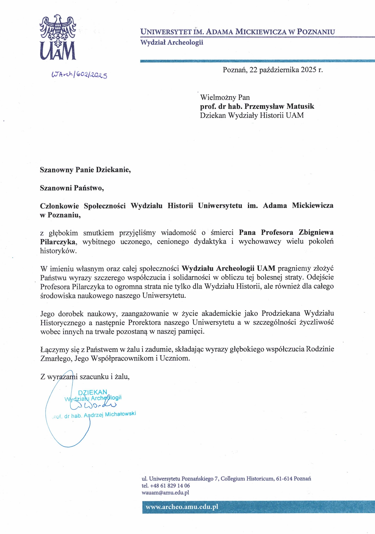 Kondolencje Wydziału Archeologii UAM